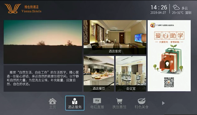 1.內(nèi)嵌電信網(wǎng)關(guān)功能,可采集運(yùn)營(yíng)商及其他直播信號(hào),并做轉(zhuǎn)碼及轉(zhuǎn)發(fā)管理解決本地化直播問題 2 內(nèi)嵌影視點(diǎn)播資源的自動(dòng)更新及管理,本地化存儲(chǔ),解決本地點(diǎn)播問題。 3 標(biāo)準(zhǔn)化PMS對(duì)接接口,可直接對(duì)接酒店客管數(shù)據(jù)庫(kù),解決終端客房電視機(jī)開機(jī)歡迎詞問題。 4 支持酒店服務(wù)、酒店介紹、在線點(diǎn)餐、在線退房、微信推廣、增值運(yùn)營(yíng)等 5 附送安卓終端APK軟件,解決終端電視機(jī)接收問題。